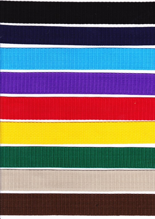 Cores lisas e listradas fita rígida, usadas para a fabricação de mochilas, sacos do Mensageiro, cintos, calçado, artigos de couro, freios, Etc. Composicion: 100% polipropileno. Larguras padrão: 15, 20, 25, 30, 40 e 50 mm. Larguras especiais: 10 a 160 mm. Ordem mínima para fabricação: 1000 m.